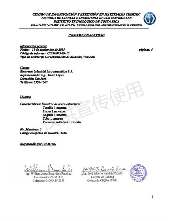 哥斯达黎加大学材料实验室原材料检验报告