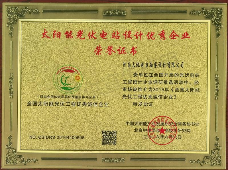 光伏优秀企业荣誉证书