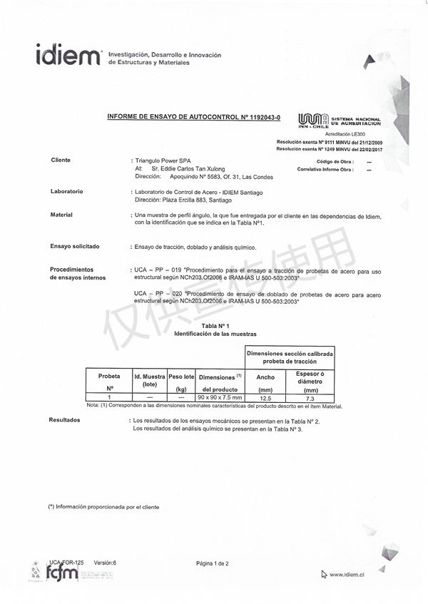 智利大学材料实验室原材料检验报告